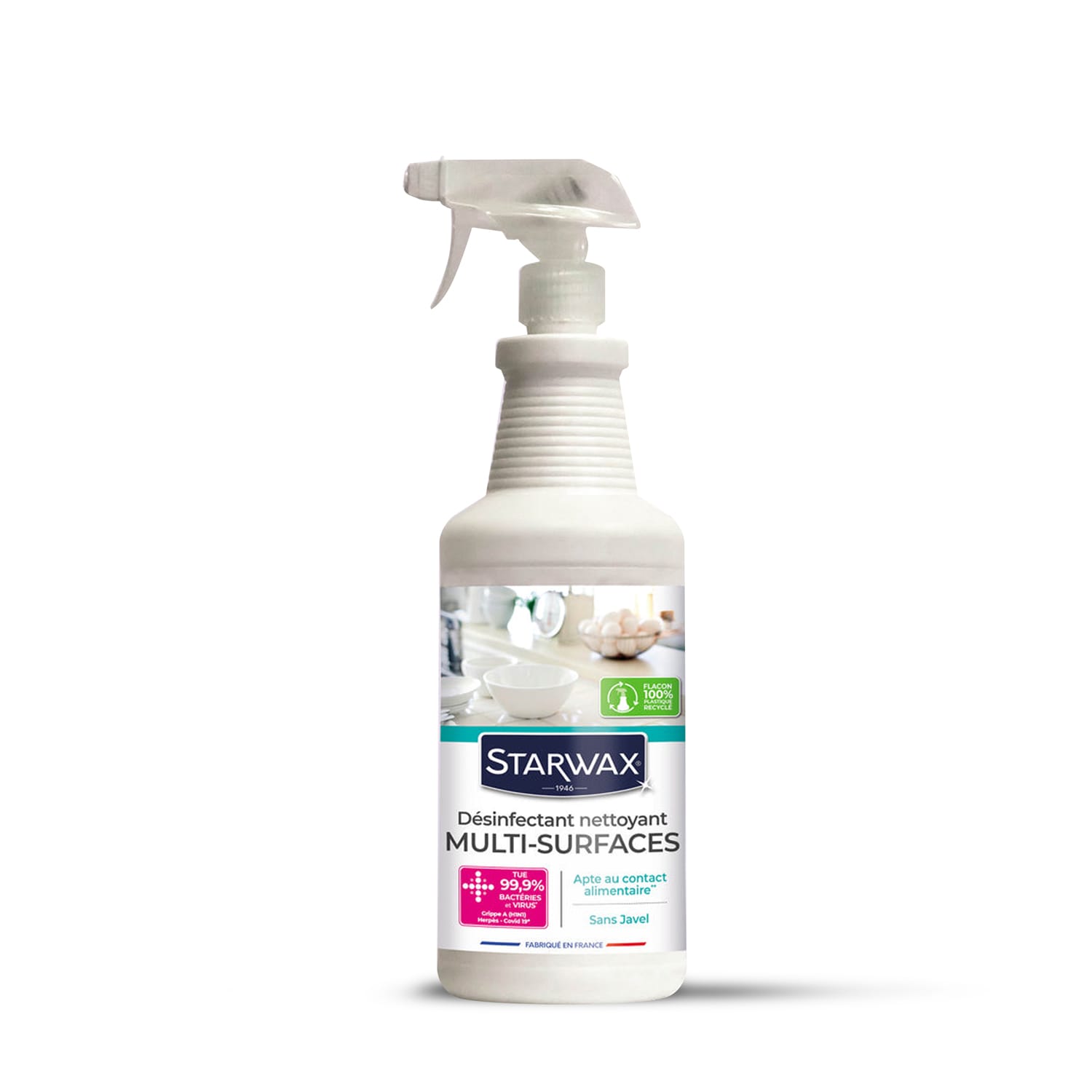 Le désinfectant nettoyant multi surfaces Starwax à un effet curatif, il élimine 99,9% des bactéries et virus*. Grande contenance pour un usage intensif, Facile à utiliser, à transporter et à stocker. Format rechargeable (à utiliser avec les bidons 1L et 5L ou le BIB 10L). Le désinfectant multi surfaces est apte au contact alimentaire**. Vous pouvez l’utiliser sur toutes les surfaces lavables.
